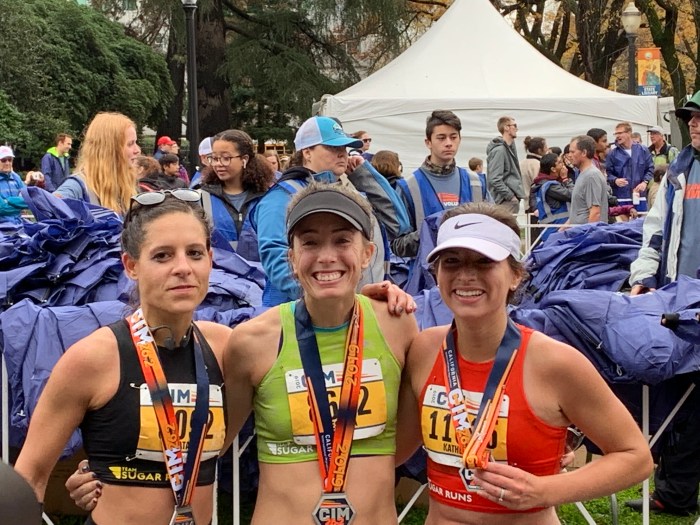 My race strategy for CIM was to run the first half with the 3:10 pace group and then to go run ahead of them trying to pick up speed as I went. I don’t think I could have executed the plan any better, other than knowing some of the aid stations wouldn’t be on both sides of the course as it caused me to miss a couple opportunities to get water. Talking with Jessica before the race on a race strategy phone call, based on my cycle, it looked like I could run in the ballpark of 3:06:00-3:08:59, and I finished right in the middle at 3:07:40. I ran my first ever negative-split in a marathon, running the first half in 1:34:40 and the second half in 1:33:00. In August 2018, I set a half PR of 1:35 and was elated; just over a year later, I ran a marathon with each half faster than that PR which is really cool to see. My slowest split ended up being a 7:19 and fastest at 6:46; it still boggles my mind how my slowest mile split was once a pace I craved to run in a half marathon. Although the splits don’t reflect it (the HR readings per mile definitely do!), this race was hard and there were a few distinct rough patches throughout it. Because of experience, I was able to recognize each of these and I am so proud of the way I responded to them and worked through them knowing that it was likely temporary if I could just hang on and keep pushing. The weather was tough for me but I know it was tough for many people. I hadn’t run outside in shorts since October living in Chicago and for the last month and a half of training was running in 20-40 degree weather. The start temperature was 55 degrees and from what I saw on other people’s Instagram stories, 95% humidity. I’m glad I didn’t look at that part before my race or it may have psyched me out since my asthma can get the best of me in humid conditions. When I finished, it was 63 degrees out, which is pretty warm for running a marathon. I ended up taking more Nuun on the course than I had planned (my plan was water only) and I think it helped me get in the extra electrolytes to combat the humidity and water loss as a result. I also think that mentally I was ready to fight after having been through so much that training cycle and knowing that I came out stronger as a result. I drew many parallels between this course and Boston – the weather conditions were similar to when I ran it, the hills and elevation was similar, it’s point to point…I think the thing that makes CIM more “runner friendly” than Boston is that the hills are all in the first 18 miles or so of the marathon and in Boston, the biggest uphill climbs begin around mile 16 when your legs have already taken a beating on the downhill. I was thankful to have done so much strength training to prepare my legs for the hills and for being able to run on rolling hills for every long run and workout to really simulate race day.