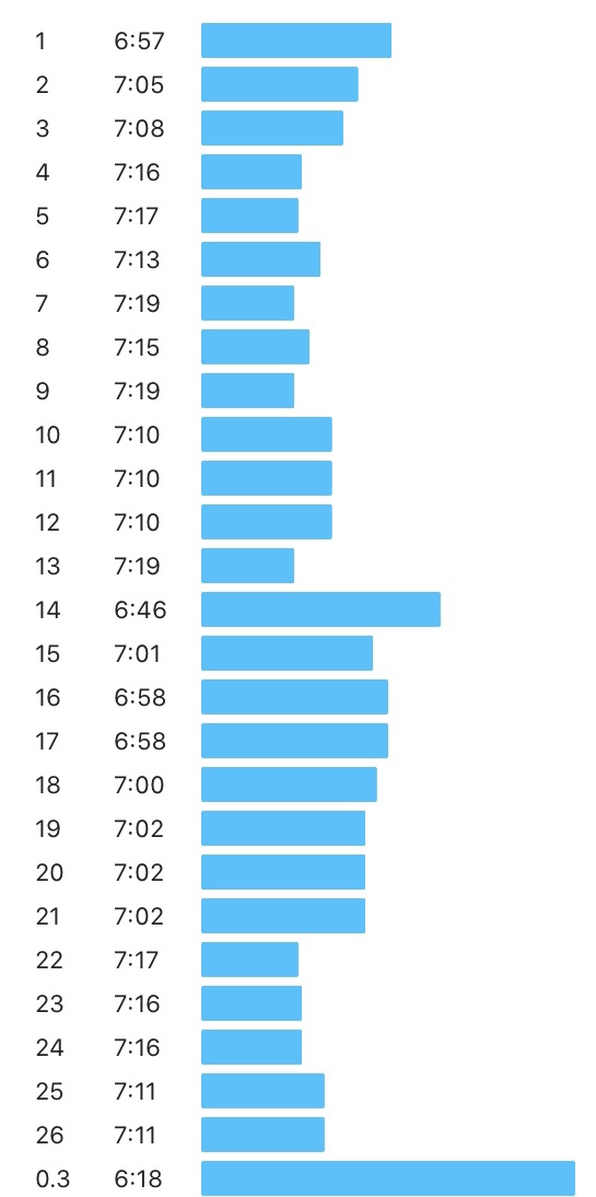 I saw Elyse (@milestomedals on Instagram) on the course just before mile 12 and it gave me a boost to see and hear her cheering. At this point, the sun was bright and shining and I was thankful I had brought my visor with me. Around mile 12.5, I was ready to take my second gel and grabbed what should’ve been a cup of water (the white cups were water, the blue Nuun cups were Nuun), squeezed some gel, then some of the liquid, and quickly realized the cups had been messed up and there was Nuun in the water cups. It was sugar overload trying to take the gel with Nuun and I began to worry that my stomach would have issues later on since sugar overload was my issue in 2018’s Chicago Marathon where I spent a half hour in porta-potties. I tried to push the thought out of my head, focusing on the fact that I’d get to see my family at the halfway point as planned, and kept moving. I crossed the halfway point in 1:34:40, just slightly ahead of the pace group at this point and pretty darn close to where I should’ve been with the 3:10 group. It was time to race now and up to me to determine how far under 3:10 I could go. I didn’t see my family until a little after halfway but after I saw them, my next mile was a 6:46. It was a little too soon to be dropping paces like that but I was just so excited to get to see them. I quickly refocused and ended up running with Natalie for a little bit in the next mile. Around mile 15, I had another tap on my shoulder and looked back to see Katie (@2fabfitchicks) waving at me. This gave me another boost to keep on moving and it was so great to see her on the course. Shortly after, I decided to take my arm sleeves off as I was getting quite warm with the sun and I put them in my pocket just in case I’d need them again. I don’t exactly remember when it started but I think it was around mile 18 that it started to rain. It had sprinkled a couple times up to this point but the rain later in the race was stronger and I was so thankful to have my visor on to keep the rain out of my eyes; I had debated not wearing it that morning since it looked like the rain was going to hold off but between the sunshine and random bouts of rain, I am really thankful that I did. I did some mental math and realized that I was on track for a big PR even if I ran 8-minute pace the rest of the race; I think every runner is guilty of doing mental math while on the course and for some reason 8-min pace is my default for calculating paces. I tried to convince myself that I was just going out for an 8-mile run, something I do all the time, and somehow it tricked me into keeping my pace consistently right around a 7-min mile.