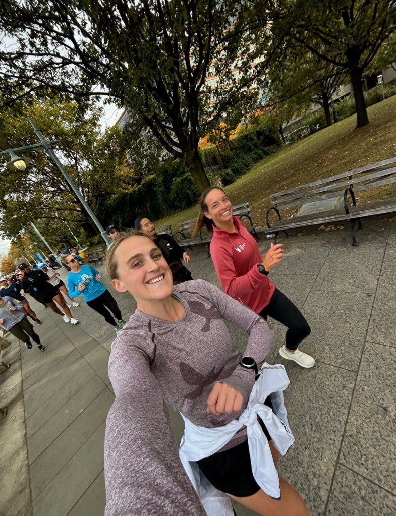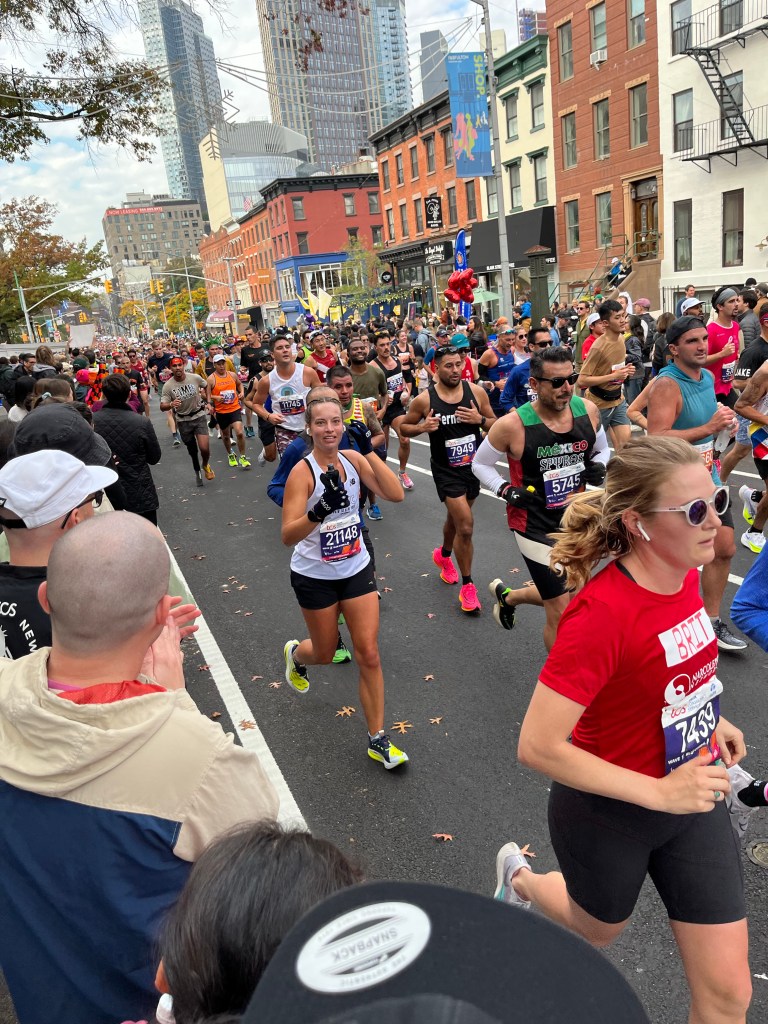 This was the first full marathon I’ve run without headphones and hearing the crowds was absolutely amazing. I have no qualms with headphones and run all my solo miles typically listening to something, but it was something I wanted to try this year and haven’t run any of my races in 2024 with them. It was scary at first but I really think it helps me stay more in tune with my body and fully experience the on-course magic (I might feel differently in a smaller marathon without other runners or fans around!). The crowds really carried me through this one. My legs didn’t feel particularly peppy, I honestly think it was more weather related as I felt the taper was solid, but I was continuing to hit paces as planned without having to force it, gradually bringing things down as a progression. I saw Ross on top of the bridge around the 5K while I was with one of my teammates, Kelly, who I had found around mile 2.5 on the course. She was my training partner for much of the cycle and at every race we’ve run this cycle we’ve been really close together so it was nice to share some of the race with her, especially when we saw our team out cheering for us, too! We had slightly different race plans though and so I went ahead, knowing she’d likely find me again later in the course with her progression planned.