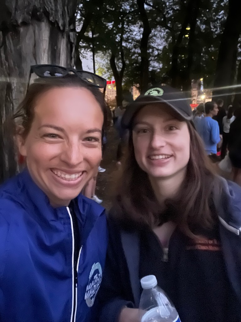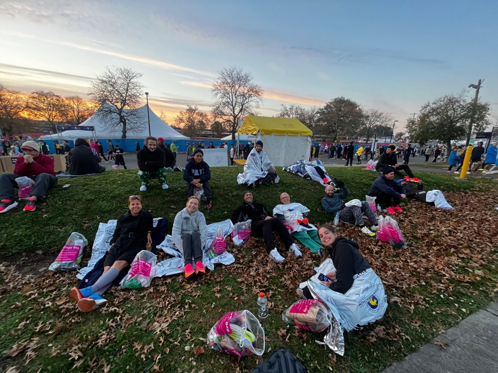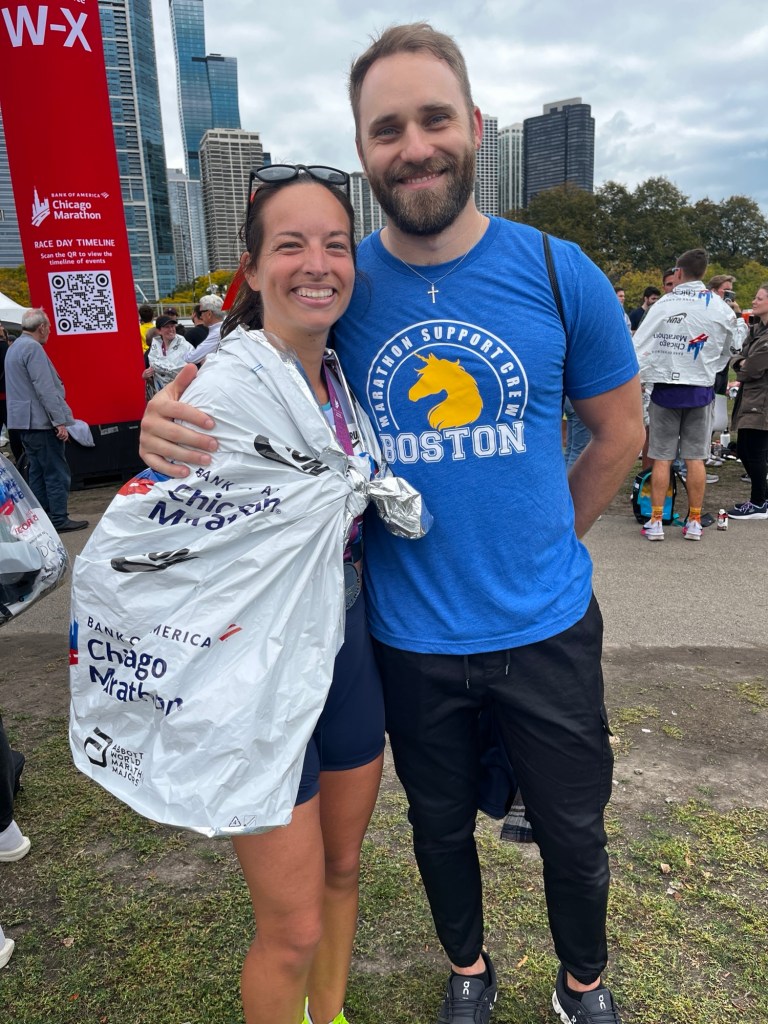 It’s funny how your legs just stop working after you run a marathon. I stayed upright and continued to walk through the medals, food, etc. but could feel my legs getting tighter and tighter as I did. After what felt like years, I headed over to the family meet-up area to meet Ross at our last initial, and gave lots of stinky, sweaty finish line hugs to my friends who surprised me at the end, too. I quickly checked the app to see how my athletes and family were faring out there and had hoped to stick around in the finisher area for a little bit, but was worried that I’d start to get cold with the wind picking up in my wet clothes so we headed back to the apartment to shower off and wait for my family to finish (I had hoped to get back out on the course to cheer for my dad but after walking back to the apartment and showering I couldn’t will myself to leave the couch and/or floor).