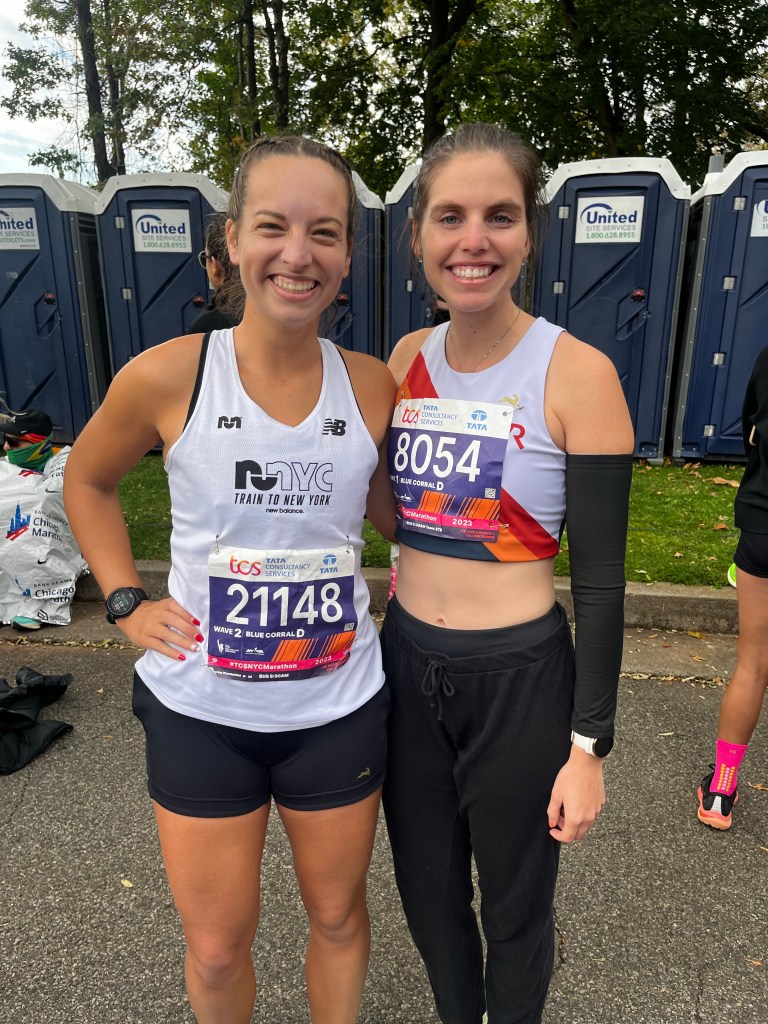 Race morning my alarm was set for 4:45 a.m. but I woke up around 4:40 so it wasn’t necessary. I actually slept the best I have (thanks to earplugs with city noise) before a marathon, getting 7 hours of sleep and feeling pretty refreshed. My sister had decided to walk over with me since she was in the first corral of wave 2 and wanted to make sure she had plenty of time to use the bathroom and get into her corral and it calmed my nerves to have someone to walk over with together. Security was so much better than last year; we arrived about 20 minutes earlier than I did in 2023 and walked right through new scanner technology it appeared. What hadn’t changed from last year were the bathroom lines; we waited for about 30 minutes in line to use a bathroom. After the bathroom, my sister and I headed our separate ways to our respective corrals. I tried looking around for local teammates of mine but couldn’t see anyone, so I found a spot where I felt comfortable in the corral and hung out until the start. I took a gel with about 15 minutes to go until we started and ditched my throwaway clothes just before our wave was scheduled to take off.
